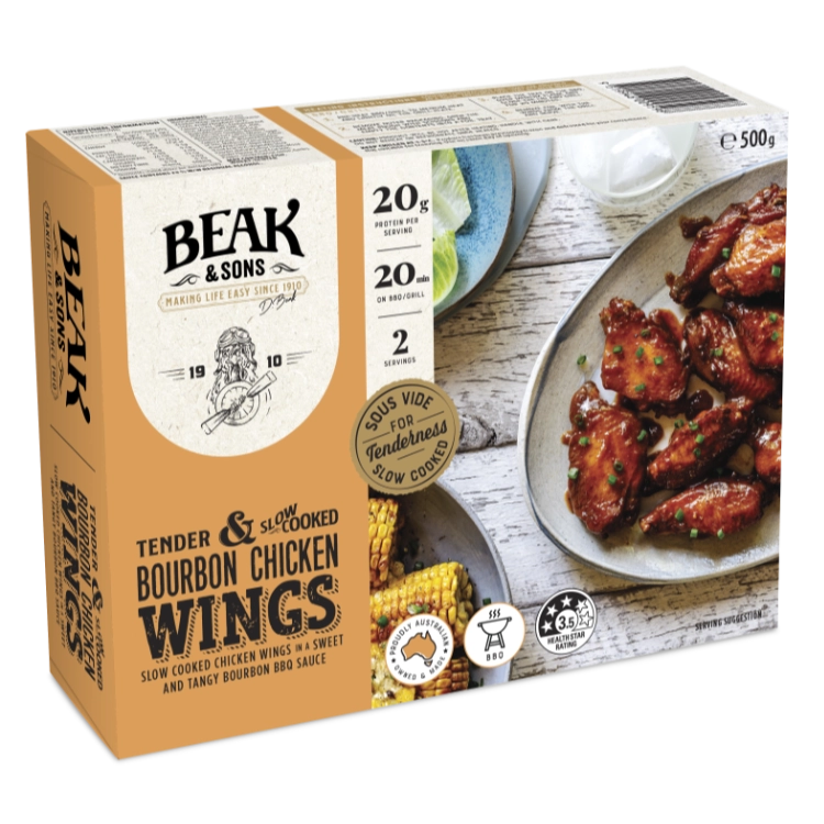 Chicken Wings: Marinated Chicken Wings (72%) (Chicken Wings, Marinade (Thickener (1442), Acidity Regulator (262), Colours (150a, 160c), Fermented Red Rice, Mineral Salt (500, 451, 450)), Vegetable Gum (407), Natural Flavours (Incl. Smoke), Bourbon Barbecue Sauce (28%) (Water, Sugar, Tomato Paste, Brown Vinegar, Onion, Tapioca Starch, Blended Bourbon (5%), Bourbon), Dijon Mustard Food Acid (262), Vegetable Stock Powder, Natural Colour (150a), Wood Smoke Flavour (Food Acid (260)), Pepper, Smoke Flavour (Onion, Garlic)).